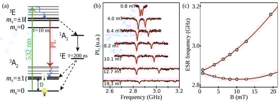 NV− center level structure. (a) Simplified electronic structure of the NV− center. (b) Example of optically detected magnetic resonance on a single NV− center in a bulk diamond. The magnetic field is applied with an angle with respect to the NV axis. (c) ESR frequencies from (b) (gray dots) compared with the full theory (red lines) obtained by computing the NV Hamiltonian eigenvalues (Equation (3)). Figure (b,c) are adapted from [68].