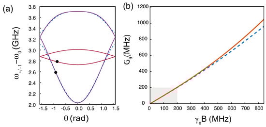 The expression of the new eigenstates and is listed in Appendix A. The frequencies of the spin resonance are plotted as a function of the angle for two different magnetic field values in Figure 4a.
