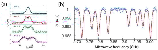 (a) ODMR for small ensembles of nano-diamond trapped in water, under increasing magnetic fields. Adapted form [84]. (b) ODMR spectrum for a small ensemble of NV− centers in a levitated micro-diamond in a magnetic field of about 50 G. Eight peaks corresponding to the four orientations of the NV− centers, are observed. Reprinted figure with permission from [86]. Copyright 2018 by the American Physical Society.