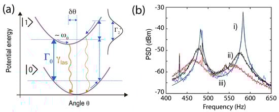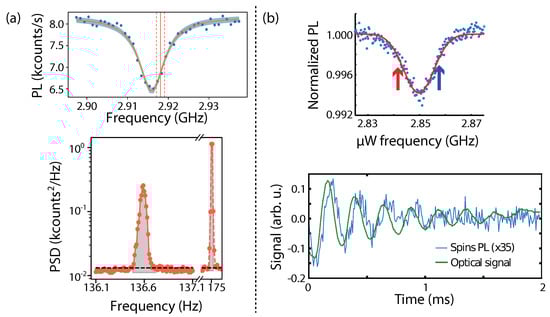 In order for NV centers to efficiently detect the center of mass motion, Gieseler et al. [35] used broadband magnetic noise to excite the motion of the trapped micro-magnet (diameter μm). The magnetic field thermal noise at the NV location, generated by the 100 μm distant driven trapped magnet, was then observed in the power spectral density (PSD) of the NV PL evolution. Thanks to the high quality factor of the oscillator (), tuning a microwave to the blue side of the ODMR signal, as shown in the top of Figure 6a, resulted in a sharp peak at the mechanical oscillator frequency.