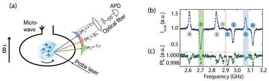 It was shown in [68] that the pumping process is not modified to first order in the transverse magnetic field. We can thus neglect the mixing contribution from the optical pumping process of the NV− center. This is also manifest in Figure 3b where the contrast of the ODMR drops significantly only with magnetic field values above ≈10 mT.