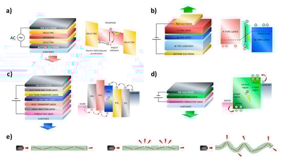 The phenomenon of alternating current electroluminescence (ACEL) was reported for the first time by Destriau in 1935 [16]. He observed that copper-doped zinc sulfide crystals, suspended in castor oil and sandwiched between two mica sheets, emitted light with the application of a strong alternating electric field. Only in 1952, after the development of transparent conducting electrodes based on tin oxide (SnO2), the first practical device was prepared [17]. It consisted of a doped ZnS powder embedded in a dielectric matrix and sandwiched between two electrodes. Today, ACEL devices are fabricated in two different ways: in the simplest approach, the dielectric and the phosphor are mixed together and then deposited as a single layer; alternatively, the phosphor can be deposited as thin film and sandwiched between two dielectrics, as reported in Figure 1a [18]. In both cases, from the electrical point of view, the structure of the device is that of a capacitor. The working principle of this kind of device involves different processes: electron injection, electron transport, electron impact and excitation, and finally radiative recombination (Figure 1a) [19]. Specifically, when a high AC voltage is applied, a high electric field is generated between the electrodes. If the electric field is sufficiently high, the electrons at the dielectric-phosphor interface can be injected into the emitting layer (hot injection). The electrons are then accelerated by the electric field toward the opposite electrode, hitting and exciting the phosphor particles. The following radiative relaxation process gives rise to visible light emission. Different phosphor materials can be used and different colors can be obtained by changing the doping impurities. Such devices are usually fabricated by using solution-based deposition techniques such as screen printing in ambient conditions, showing great potential for large-area displays. Considering the working principle, different typologies of electrodes can be used with at least one of the two being transparent without stringent requisite in terms of work function. The total thickness of the device is in the order of tens of microns and such a characteristic confers sufficient flexibility of the device but also good mechanical stability. Regarding the optoelectronic properties, ACEL devices show a wide viewing angle, fast response time, low power consumption, and high contrast in addition to simple manufacturing and cost-effectiveness [18]. On the other hand, such devices show limited luminance values and the high AC voltage values usually employed (50–200 V) can be too hazardous for wearable applications. Furthermore, the ACEL device can be damaged by humidity and for such reason an encapsulation process is necessary [20].