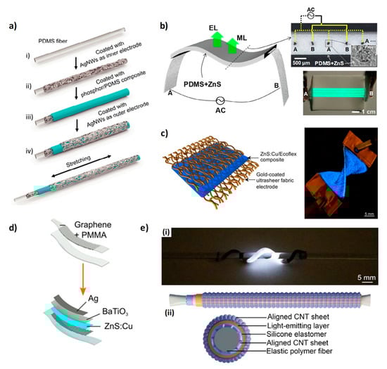 Examples of ACEL devices integrated on both single fibers and fabrics are discussed below and they are summarized in Table 1 and Table 2. One of the first examples of ACEL devices on single fibers that can be integrated with woven and knitted fabrics was demonstrated in 2012 [21]. The device consisted of a conductive yarn as the electrode, an insulating layer, an EL phosphor layer, and a second electrode based on a conductive yarn helically wound. An automatic dispensing and curing process was employed for the deposition of the insulating and emitting layer. The electro-optical characteristics of the light-emitting fiber are poor and need to be optimized, but the authors reported a high throughput fabrication process of ACEL devices on fiber. Another example of a fiber-based ACEL device created by using a scalable deposition technique was reported by researchers of Drexel University [22,23,24]. It consists of a slot-die coating system customized for a single fiber. The resulting devices were tested under different mechanical conditions and the authors demonstrated an improvement in strength and robustness when the devices were integrated into a knitted structure [24]. ACEL devices on flexible polyethylene terephthalate (PET) single fibers were also fabricated by dip-coating techniques and an AgNWs solution was employed for the transparent electrode deposition [25]. The device shows a luminance of about 200 cd/m2 at 195 V and 2 kHz with excellent flexibility, good mechanical characteristics, and wearability. The substitution of the material employed for the fiber fabrication can give an added value to the device. Flexible and water dissolvable PVA (poly(vinyl alcohol)) fibers were used for ACEL devices that can completely disintegrate after 180 min of water immersion with great potential in the reduction of e-waste [26]. A stretchable ACEL device (Figure 2a) was demonstrated by using a PDMS polydimethylsiloxane (PDMS) fiber with luminance values that do not change with stretching strain [27]. Stretchable single-fiber ACEL devices were also fabricated by the group of Peng by using two different methods [28,29]. The first one consists of 3D printing an elastomeric light-emitting tube composed of ZnS phosphor powders and silicon elastomer sandwiched between two aligned carbon nanotube sheets (Figure 2e) [28]. Such a device can be stretched up to 200% and shows a luminance of about 15 cd/m2 at 6.4 V/μm and 1500 Hz. The second method is based on the fabrication of a stretchable electroluminescent fiber via a continuous one-step extruding process. The fiber is composed of two inner hydrogel electrodes and a ZnS/silicon elastomer blend; it shows a luminance of about 250 cd/m2 at 8 V/μm and 1500 Hz when the 40% of ZnS is employed and it could be stretched up to 800% [29]. Graphene is another possible transparent electrode that can be interesting for light-emitting devices and the group of Craciun developed an ACEL device on top of tape-shaped graphene-covered fiber, the architecture of which is shown in Figure 2d [30].