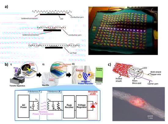 (a) Schematic illustration of LED integration with textile and picture of a textile LED display. (b) Representation of wireless-powered wearable μLEDs with a scheme of the circuit. (c) Scheme of the E-yarns structure with an LED and related picture. (a) Reproduced with permission [56]. Copyright 2013, NC State University. (b) Reproduced with permission [57]. Copyright 2018, Elsevier. (c) Reproduced under the terms of the CC BY 4.0 license [58].