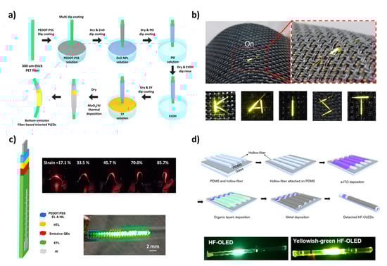 - Kwon, S.; Kim, H.; Choi, S.; Jeong, E.G.; Kim, D.; Lee, S.; Lee, H.S.; Seo, Y.C.; Choi, K.C. Weavable and Highly Efficient Organic Light-Emitting Fibers for Wearable Electronics: A Scalable, Low-Temperature Process. Nano Lett. 2018, 18, 347–356. [Google Scholar] [CrossRef]