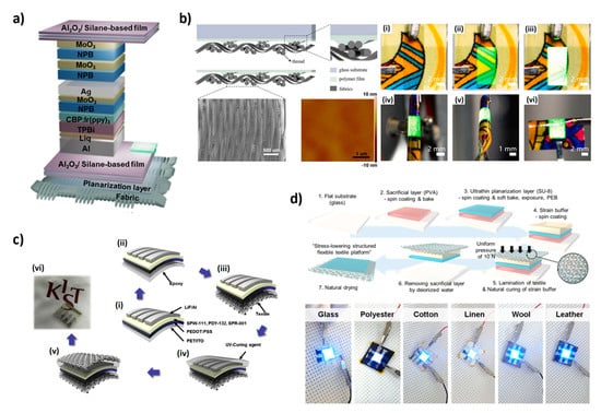 - Kim, W.; Kwon, S.; Han, Y.C.; Kim, E.; Kim, H.C.; Choi, K.C.; Kang, S.H.; Park, B.-C. 28.1: OLEDs on Textile Substrates with Planarization and Encapsulation using Multilayers for Wearable Displays. In SID Symposium Digest of Technical Papers; SID: Campbell, CA, USA, 2014; Volume 45, pp. 364–366. [Google Scholar] [CrossRef]