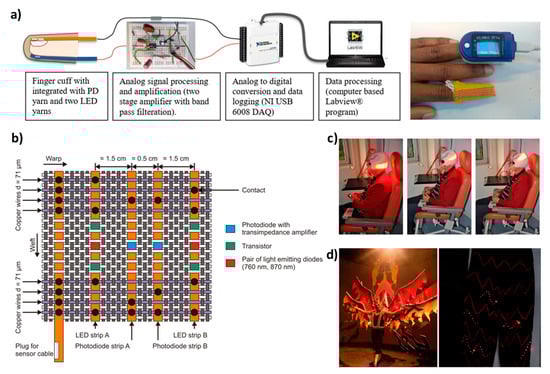 - Satharasinghe, A.; Hughes-Riley, T.; Dias, T. Photodiodes embedded within electronic textiles. Sci. Rep. 2018, 8, 16205. [Google Scholar] [CrossRef] [PubMed]
