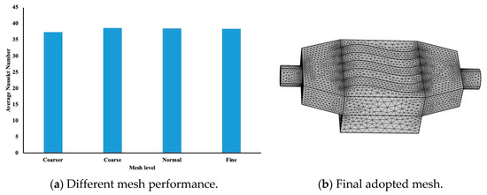 The mesh levels that COMSOL supports and the elements number for each mesh level are shown in Table 2. The average Nusselt number was evaluated at 1 mm below the interface in the aluminum block, and the results are represented in the Figure 2a. Here, the heat flux applied is equal to 75,000 W/m2, and the conductivity of the water was used to evaluate the Nusselt number. It is evident that a coarse or normal mesh level will be suitable to be used in the COMSOL model. Figure 2b, presents the finite element mesh used in our simulation with normal mesh level.