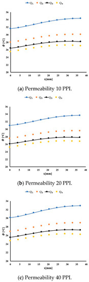 Figure 3 presents the temperature distribution 1 mm below the interface for the three porous material types and for four different flow rates as stated earlier. The temperature profile shows that at the beginning of the flow entrance, the boundary layer is very small, thus allowing the heat to pass from the solid block to the fluid. However, as the boundary layer starts developing, it appears that it reduces the amount of heat extracted from block. This temperature profile is identical regardless of the permeability of the material. By carefully examining the temperature magnitude, it is noticeable that as the permeability varies from 10 PPI to 40 PPI, the heat extraction is improving. This is shown as the temperature in the heated block drop in magnitude. It is evident that having porous material helps to absorb more heat. To study further the heat extraction, Figure 4 presents the local Nusselt number variation for the case or a permeability of 40 PPI.