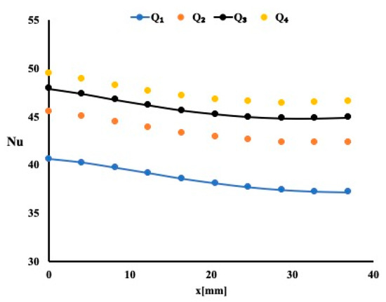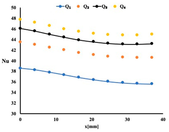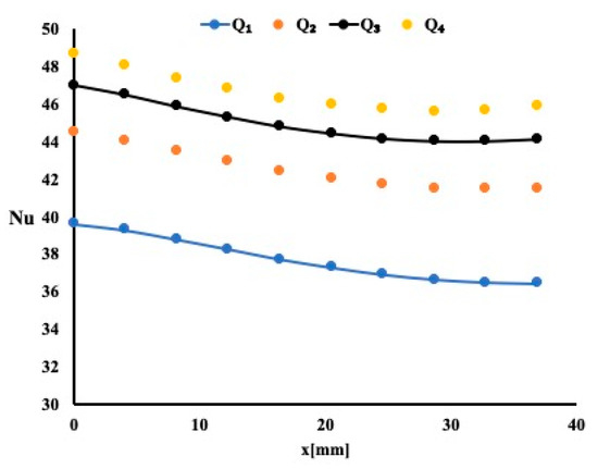 The model was repeated with a hybrid fluid consisting of a single nanoparticle containing Al2O3 and Copper. Figure 6 displays the local Nusselt number variation for the case of a 10 PPI permeability and for the four flow rates. The Nusselt number variation profile is identical to the other cases, but its magnitude is different.