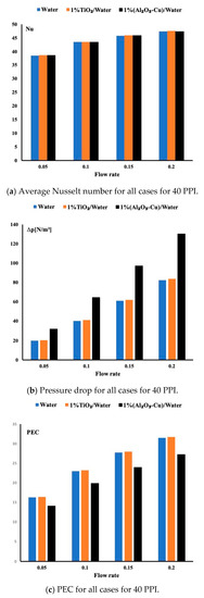 In the previous sections, we have investigated the importance of heat removal based on different flow rates and porous medium permeabilities. However, an important parameter worth investigation is the pressure drop. One may find a suitable fluid for heat removal but at the expense of higher pressure drop. To overcome this issue, it is important to combine the heat effect and the fluid effect by using the performance evaluation criteria. As shown in Equation (10), it is defined as the ratio of the average Nusselt number and the friction factor to the power one third. The friction factor is defined in Equation (11), which combines the physical properties of the fluid, the inlet velocity and the geometrical dimension of the channel. Figure 7 displays the average Nusselt number, the pressure drops and the performance evaluation criteria for all cases when the permeability is set at 40 PPI. Figure 7c displays the PEC and shows that the TiO2/water nanofluid exhibits a slightly better performance than water, and the hybrid is the worst candidate between the three studied fluids. In order to determine the reason, Figure 7a displays the average Nusselt number for the three fluids. Almost all of them have a close to identical heat enhancement which may indicate that the waviness of the channel enhances heat removal regardless the fluid used. However, in Figure 7b, a large pressure drop is found for the hybrid fluid contrary to the other remaining two fluids. Thus, there is justification for a higher PEC for the water and the TiO2 nanofluid.