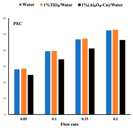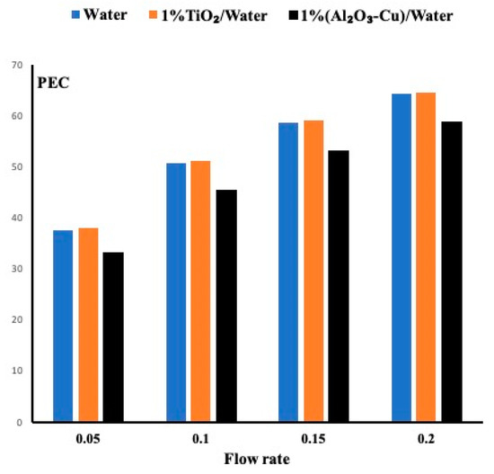 The performance evaluation criterion is an important parameter which combines the average Nusselt number and the friction factor. Nanofluid and hybrid fluid exhibit a larger pressure drop when compared to water. In our analysis, the performance evaluation criteria is shown in Equation (10).