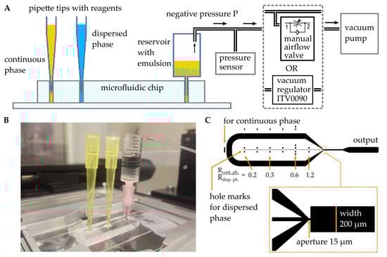 Droplet generation in a flow-focusing microfluidic device by applying negative pressure to the output reservoir: (A) circuit diagram of the setup; (B) general view of the microfluidic device; (C) design of the microfluidic chip.