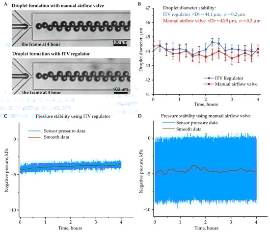 Stability of the droplet generation regimes. (A) Images of droplet generation in the microfluidics device using an ITV regulator and a manual airflow control valve; (B) droplet diameters during the 4 h stability test. Error bars indicate standard deviation. Pressure in the outlet reservoir was measured by an external pressure sensor during the 4 h stability test in the setup with the ITV regulator (C) and the manual airflow control valve (D). The experimental data were smoothed by Loess regression (span = 0.1).