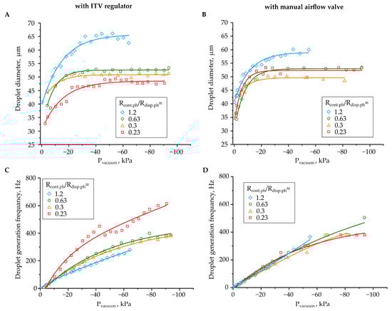 The experimental data presented in Figure 3 indicate that droplet diameters and their generation frequencies strongly depend on the value of the applied negative pressure in the outlet reservoir. As the pressure difference between the inlets and the outlet of the microfluidic device increased, liquid flow rates increased, which led to increases in droplet diameters, from 33–35 μm to 45–65 μm, depending on the hydrodynamic resistance ratio Rcon.ph./Rdisp.ph, while using the ITV regulator. However, at highly negative pressures, below −30 kPa, it was almost independent of the pressure. This happened due to droplet diameters being mostly determined by the ratio of the capillary numbers or flow rates of the dispersed and continuous phases, and is independent of their absolute values (Figure 3A,B) []. While using the airflow control valve, the droplet diameter range was slightly lower, from 35 μm to 60 μm.