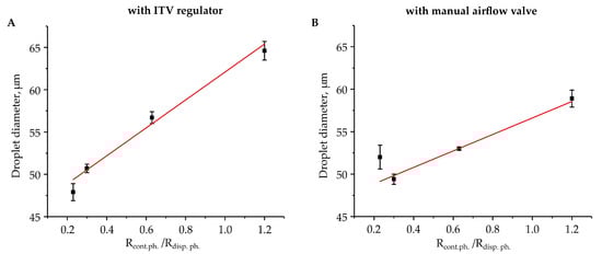 Droplets diameters as a function of the ratio between the hydrodynamic resistances of the continuous and the dispersed phases, Rcon.ph./Rdisp.ph. Droplet generation was performed in the setup with (A) the ITV regulator and (B) the manual airflow control valve. The pressure in the outlet reservoir was set to −50 kPa, when droplets diameter was insensitive to its value. Error bars indicate standard deviation.