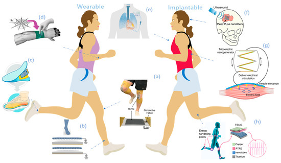Wearable electronics and implantable devices have drawn much attention in academic research and industry [1]. However, the traditional wearable and implantable systems were bulky, with high replacement frequency and a short life span [2]. In recent years, with the contemporary increased demands of multiple and ubiquitous wearable and implantable applications, human-oriented self-powered systems have become a hot issue [3,4].