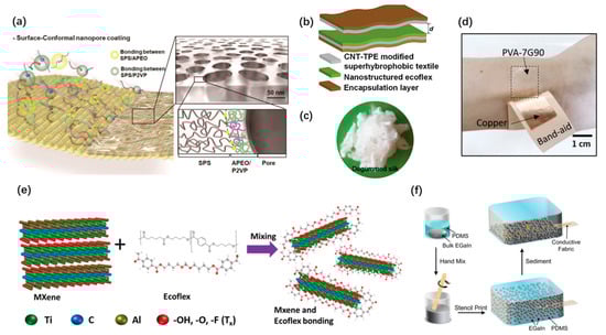 Owing to the extensively exiting of triboelectrification, TENGs have greater selectivity in materials. Surface modification on textiles is an efficient approach to obtain excellent and low-cost friction layers for wearable TENG. It has been widely studied [44,59]. Chanho Park et al. put forward a one-step route for developing rapid wet processable surface-conformal nanoporous films [59], as shown in Figure 2a, which are made up of a ternary polymer blend of sulfonic-acid-terminated poly(styrene), poly(2-vinylpyridine) and amine-terminated poly(ethylene oxide) in benzene. These mixed materials can result in well-defined nanopores. As shown in Figure 2b, Feng Wen et al. proposed a simple carbon nanotube (CNT)/thermoplastic elastomer coating method to achieve super hydrophobicity of the textile TENG [44]. Biocompatible and biodegradable materials, especially bio-absorbable natural materials such as wood, silk, wheat cotton, and cellulose, provide more opportunities for wearable and implantable applications. Meng Su et al. proposed a CNT-silk mixing layer as the conductive friction material to realize a wholly biodegradable TENG [53]. Qianqian Niu et al. adopted silk nanoribbons with adjustable sizes and stable aqueous conditions and developed an all-silk bio-TENG [61], as shown in Figure 2c. Moreover, biodegradable polymers such as polyvinyl alcohol (PVA) and polycaprolactone (PLC) were widely used. Ruoxing Wang et al. proposed a wearable TENG based on biodegradable PVA [45], as shown in Figure 2d. The fabricated PVA-gelatin composite film provides a choice for achieving skin-friendly TENG. Stretchability would be an essential requirement for specific wearable and implantable TENGs. Conductive 2D materials and liquid metals can help. Md Salauddin et al. presented a conductive fabric-based TENG, which is made up of MXene (Ti3C2Tx) nanosheets and Ecoflex composite [56], as shown in Figure 2e. Chengfeng Pan et al. presented an ultra-stretchable TENG based on the sedimented liquid metal elastomer composite [60], as shown in Figure 2f. It possesses excellent conductivity under ultrahigh stretchability.