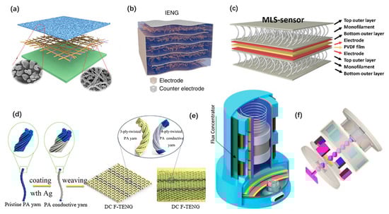 The large number of materials enables theoretical models to be transformed into nanogenerators with various structures, which not only realizes the functions of the device, but also has the extra advantages of the materials. Benefiting from the outstanding flexibility, wearable nanogenerators can be easily designed as simple thin-film structures. These nanogenerators are generally attached on the skin. Yang Jiang et al. developed an ultrathin skin-like TENG [74], as shown in Figure 4a. It adopted a single-electrode structure with a stretchable and transparent electrode, and forms a comfortable and conformal device that can attach to the epidermis. Xiao Peng et al. proposed an all-nanofiber single-electrode TENG with a hierarchical porous structured friction film [58], which is stretchable, breathable, and biodegradable. Wearable nanogenerators existing as part of textiles, shoes, or other wearable accessories are prevalent as well. Multiple-layered plain structures and 3D textile structures were developed to improve the output performance of nanogenerators. Long Gu et al. proposed a PENG with a three-dimensional intercalation electrode [77], as shown in Figure 4b. It can charge a 1 μF capacitor from 0 V to 8 V in 21 cycles. Seongcheol Ahn et al. proposed a 3D textile structured PENG with pre-strained monofilament [49], as shown in Figure 4c. The 3D structure of the monofilament is employed as a pressure transmitter for piezoelectric amplification to improve the sensitivity. A direct current fabric TENG with a plain structure was proposed by Chaoyu Chen et al. [81], as shown in Figure 4d. It can produce high DC outputs to harvest the energy from the electrostatic breakdown phenomenon of clothes during human motions. Most of the energy generated by human motions is at low frequency and low acceleration [62]. Inertial structured spring-mass systems have been proved to be an efficient way to achieve high energy harvesting efficiency for wearable nanogenerators. They were usually designed as hybrid nanogenerators. Pukar Maharjan et al. proposed a wearable hybrid nanogenerator that shows high performance under low acceleration (≤1 g) and low frequency (≤6 HZ) human motions [64], as shown in Figure 4e. Cheng Yan et al. designed a linear-to-rotary hybrid nanogenerator to achieve high output performance by frequency enhancement [42], as shown in Figure 4f.
