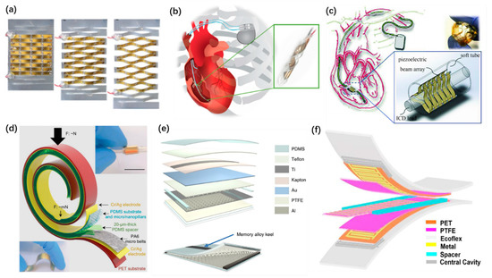 For in vivo applications, the implantable nanogenerators usually employ thin-film structures and their transformation. Transformative thin-film structures are widely used in implantable PENGs. A circular piezoelectric belt is one of the simplest and effective ones [119]. Sophisticated designs of the transformation are implemented to obtain enhanced electrical outputs. Rujie Sun et al. proposed a kirigami stretchable structure of PENG [83], as shown in Figure 5a. It improves the tensile property and flexibility of PENG to implant on the organs and achieves much higher outputs than unstructured design. Lin Dong et al. developed implantable PENGs with a helix structure [116], as shown in Figure 5b and a buckled beam array design [114], as shown in Figure 5c. These PENGs deform through the movement of the pacemaker lead and generate stable electricity. Most of the implantable TENG adapt a contact-separation structure. Owing to the limited separation space in the body, the structures should be well designed to maintain the practical work of TENGs. Bolang Cheng et al. proposed a mechanically asymmetrical TENG [120], as shown in Figure 5d. A 20 µm thick PDMS spacer is used, and the TENG belt can be twisted and rolled up to different shapes. It can monitor the microscopically weak intestinal peristalsis. However, due to the low stiffness of the friction layers, the separation of implantable TENGs will be reduced, which may lead to decreasing output performance. To overcome this, an implantable TENG with a 3D sponge spacer was developed [101], as shown in Figure 5e. A memory alloy ribbon serving as the keel of the friction layer is employed, to obtain a higher long-term stability. Zhao Chaochao et al. fixed two magnets on the back of the friction layers to produce repulsion separation when contact occurs. Thus, the life cycle of the TENG is extended [94]. Well-designed sliding mode TENGs can also work well in vivo. Jun Li et al. reported a stretchable micro-grating structured TENG [115], as shown in Figure 5f. It was implanted inside a rat’s abdominal cavity to harvest energy from ventral diaphragm movement.