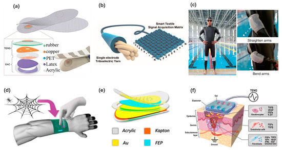 Wearable electronics have brought conveniences to our daily life. In the face of the increasing demand for self-powered wearable systems, TENGs have played an important role in active sensing and mechanical energy harvesting. Clothing is a necessity in our daily life. Putting the concept of wearable TENG on clothes is bound to be a hot issue pursued by researchers. Textile and fabric-based TENGs have been developed rapidly. Wenjing Fan et al. presented a textile TENG sensor array with high-pressure sensitivity [78]. This device is employed as a noninvasive method to evaluate the signal generated by cardiovascular disease and sleep apnea syndrome. Zhiming Lin et al. reported a smart insole with TENG embedded as an active sensor for real-time gait monitoring [69], as shown in Figure 6a. It has high durability and excellent mechanical robustness to monitor the abnormality of gait for rehabilitation assessment. Liyun Ma et al. proposed an ultralight single-electrode textile-based TENG with helical hybridized nano-micro core-shell fiber bundles [65], as shown in Figure 6b. It enables harvesting biomechanical energy and monitoring tiny signals from human motions. TENGs come in a wide range of forms besides fabrics. Yu Song et al. developed a self-powered wearable wireless sweat sensing system based on a TENG [54]. As shown in Figure 6c, Yang Zou et al. designed a bionic stretch TENG by imitating the electric eel’s power generation principle [30]. It has a broad application prospect in underwater motion detection and submarine rescue. With the advent of the intelligent era, objects are connected through the internet, and wearable applications for human–machine interfaces and intelligent systems are also arising. A smart glove with a haptic feedback was designed based on TENG to serve as a simple human–computer interaction method [31]. Qiongfeng Shi et al. reported a bio-inspired spider-net-coding interface with great flexibility and scalability [55]. By employing a single-electrode TENG, detection and control of multiple directions are demonstrated, as shown in Figure 6d. Hengyu Guo et al. proposed a self-powered acoustic sensor [20], as shown in Figure 6e. It created a new acoustic system by using TENG. The acoustic sensor has ultrahigh sensitivity, which could reach 110 mV/dB. Wearable TENGs are adopted for biomedical applications as well. Zhirong Liu et al. developed a TENG as a stable voltage pulse source to trigger plasma membrane potential and membrane permeability for intracellular drug delivery [67]. The delivery efficiency of this system is 90%, and the cell survival rate is more than 94%. Yonghong Li et al. devised a wearable ionic TENG, which has a stretchable gel composition [75]. The electricity generated by this TENG from biomechanical energy is used in damaged tissues, and it accelerates the wound healing, as shown in Figure 6f.