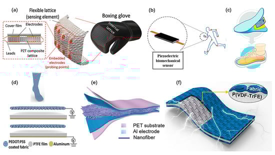 Wearable PENGs demonstrate potential applications for power supply, motion monitoring and health monitoring in wearable systems as well. Desheng Yao et al. presented a wearable boxing glove based on 3D printed flexible piezoelectric lattice with stretch dominated microarchitectures [37], as shown in Figure 7a. It achieves high electromechanical sensitivity and structural functionality. Spatially resolved and time-resolved mapping of reaction punching forces exerted to knuckles of the hand during boxing activities could be obtained. Iqra Choudhry et al. reported a nanocomposite-based PENG fabricated by dispersing various piezoelectric nanoparticles (BaTiO3, ZnO, and PZT) graphene nano-powder in a silicone matrix [80]. As shown in Figure 7b, it serves as a biomechanical energy harvester and a self-powered motion sensor. Sun Yue et al. proposed a ZnO/PAN nanofiber-based PENG integrated with a plate heater for personal thermal management [48], as shown in Figure 7c. Minglu Zhu et al. designed a self-sufficient sock composed of hybrid nanogenerators [32], as shown in Figure 7d. It shows good ability in energy harvesting and motion sensing. Yuanjie Sun et al. proposed a muscle-fiber-inspired nonwoven piezoelectric textile with tunable mechanical properties to mimic the muscle fiber, as shown in Figure 7e [52]. It achieves high sensitivity in the monitoring of various physiological signals. Jaegyu Kim et al. developed a highly flexible fabric-based wearable PENG with high efficiency and strong integration [72], as shown in Figure 7f. Beyond these, Shu Du et al. developed a bio-inspired hybrid patch with a PENG embedded [79]. The PENG is employed as an electrical stimulator to facilitate skin wound healing.