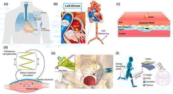 Harvesting energy from the biomechanical energy of heartbeats, blood pressure, and other biological rhythms to power implantable electronic devices has had an upsurge in recent years. Han Ouyang et al. developed an implanted symbiotic cardiac pacemaker based on TENG [101], as shown in Figure 8a. The implanted TENG can obtain 0.495 μJ electrical energy in each cardiac cycle. Liu Zhuo et al. reported a self-powered endocardial pressure sensor using TENG [105], as shown in Figure 8b. It can monitor in real time to detect arrhythmias. Owing to its specialty in lightweight and flexibility, TENG can be implanted in subcutaneous tissues. Hu Li et al. proposed a hybrid energy harvesting system that consisted of a TENG and a glucose fuel cell [92], as shown in Figure 8c. This design strengthened the flexibility of harvesting multiple sources of bioenergies and enhanced electrical outputs. The high-voltage outputs of TENG were adopted to stimulate muscles and nerves as well. Jiahui Wang et al. proposed a self-powered muscle stimulation system based on TENG [98], as shown in Figure 8d. The TENG can directly stimulate the muscle to treat the muscle dysfunction. The multi-channel electrode adheres well to the surface of muscle. Sanghoon Lee et al. proposed a TENG neurostimulator to realize the mechano-neuromodulation of autonomic pelvic nerves [108]. As shown in Figure 8e, the stimulator system consists of a stacked TENG and a flexible neural clip interface. Rui Shi et al. proposed a self-powered treatment strategy employing a TENG to charge a titanium implant surface [99], as shown in Figure 8f. The charged titanium implant shows a suitable antibacterial property. It can serve as an antibacterial biofilm and helps to promote the osseointegration.
