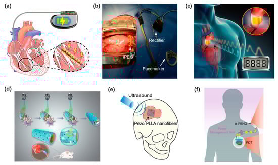 Implantable PENGs and piezoelectric sensors have shown great potential in the evaluation and diagnosis of cardiovascular diseases. Great efforts have been made to power cardiac pacemakers by using PENGs. Zhe Xu et al. developed a kirigami inspired PENG [97], as shown in Figure 9a. The PENG is fixed on the lead of the pacemaker to harvest energy from the lead’s motion caused by heartbeats. Zhiran Yi et al. proposed a self-powered leadless cardiac pacemaker [96]. The PENG used to power the pacemaker obtains a short-circuit current of 30 μA and an open-circuit voltage of 8.1 V. Li Ning et al. proposed an implantable PENG, as shown in Figure 9b. It can directly power a cardiac pacemaker via a rectifier [106]. Xiaoliang cheng et al. presented an implantable self-powered blood pressure monitor based on a PENG [119], as shown in Figure 9c. Good linearity was achieved between the peak output voltage of the PENG and the flow pressure, with a sensitivity of 173 mV/mmHg. As shown in Figure 9d, Qian Yun et al. designed a ZnO based PENG scaffold [100]. It plays a role as an in vivo stimulus to accelerate the speed of tissue healing and nerve conducting. Ritopa Das et al. proposed a new method for bone regeneration [85], as shown in Figure 9e. A biodegradable PENG scaffold driven by ultrasound is adapted as an electrical stimulator to promote bone regeneration. Liu Zhuo and others designed a PENG to power the photodynamic therapy system for cancer treatment to inhibit the growth of subcutaneous tumor cells in mice [104], as shown in Figure 9f. The inhibition rate reached 87.46%.