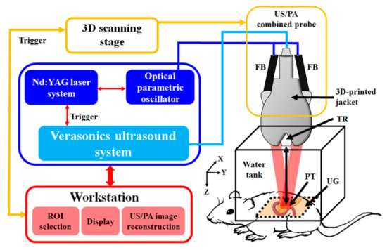 Schematic diagram of the developed dual-modality US/PA imaging system. Using the photoacoustic effect, US waves were generated by delivering light generated by a laser to the imaging target with a pulse repetition rate of 20 Hz using fiber bundles. The US waves were then detected by a 17.5-MHz transducer and processed through a Verasonics ultrasound system. The developed PA probe includes a removable fiber bundle-based illumination system (FB), a single US transducer (TR), and a customized jacket. Two rectangular parts constituted the output end of the fiber bundle, and the input end was circular in shape. ROI, region of interest; PA, photoacoustic; US, ultrasound; TR, ultrasound transducer; FB, fiber bundle; PT, pancreatic tumor; and UG, ultrasound gel.