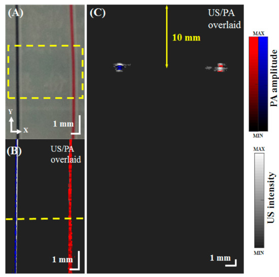 To test the ability of the developed PA system to image blood vessels, tube phantoms (Figure 2A) were filled with red and blue ink to mimic oxygenated and deoxygenated blood, respectively. The region marked by a yellow-dashed rectangle was imaged using US/PA. Maximum amplitude projections (MAPs) of a C-scan image composed of serial cross-sectional images of the tubes are shown in Figure 2B. The US, PA and overlaid US/PA MAP images of the vascular phantoms are shown in Figure 2B. The yellow-dashed line marks the location of the cross-sectional scan shown in Figure 2C. At 750 nm, the PA signal of the blue ink was dominant. Because the signal intensity of both ink colors was similar at 850 nm, the proportional difference (PARed = PA850/PA750) between the two excitation wavelengths was calculated to obtain the red ink signal [4]. The resulting overlaid images shown in Figure 2B,C show the optical absorption characteristics of the blood vessel phantoms and provide anatomical and functional information [9].