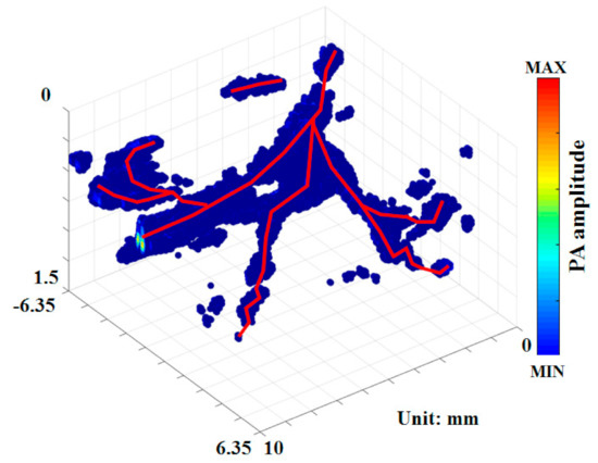 A PA C-scan (3D) image of the skin vasculature on the back of a rat obtained at a wavelength of 750 nm is shown in Figure 3. MAP matrices containing the peak amplitudes of the PA signals corresponding to absorbing structures on a pixel-by-pixel basis were used to plot the figure [29]. The red lines indicate the position of blood vessels. An area of 12.7 × 10 mm with a depth of 1.5 mm was scanned at a 50-µm step size.