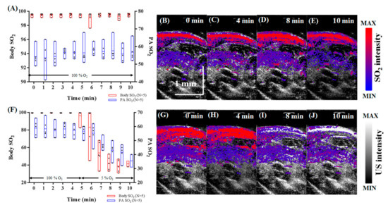 The results for the controlled hypoxia challenge are shown in Figure 4. For Figure 4A–E, the inhaled gas was maintained at 100% O2 for 10 min. In Figure 4A, the body SO2 measured using pulse oximetry and PA SO2 remained at an average of 99.41% and 56.12%, respectively. As expected, there was no significant change in the tissue oxygen level [36]. The PA SO2 images (Figure 4B–E) collected at 0, 4, 8, and 10 min also showed no changes in SO2. For Figure 4F–J, the inhaled gas was maintained at 100% O2 for 5 min before switching to the carbogen mixture for another 5 min to induce hypoxia. Figure 4F shows a significant decrease in both body and PA SO2. The body SO2 was significantly decreased from an average of 99.7% to 38.74%, whereas the PA SO2 was decreased from an average of 58.8% to 35.5%. The PA SO2 images shown in Figure 4G–J indicate that the oxygenated area (red) decreased after the switch to carbogen, while the ischemic area (blue) increased. These results demonstrate that the assessment of tissue SO2 using our PA imaging system reflects the changes in body SO2 measured using pulse oximetry during hypoxia challenge. A study by Xing et al. showed that changes in hemoglobin oxygen saturation and carboxyhemoglobin saturation could be observed in blood vessels using PA microscopy during carbon monoxide challenge [45]. The resolution of our US/PA imaging system does not allow for observation of single blood vessels but allows for monitoring of larger areas of tissue. After evaluation of hypoxia in a controlled in vivo setting, our next step was to measure hypoxia in the pancreatic tissue of normal and tumor-bearing mice 9.