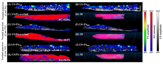 Relative SO2 levels in normal pancreatic regions in three different mice. SO2 was calculated as the percentage of oxygenated hemoglobin relative to total hemoglobin based on dual-wavelength PA imaging at 750 and 850 nm. (A,E,I) PA images acquired at 750 nm overlaid with grayscale US B-mode images. (B,F,J) PA images acquired at 850 nm overlaid with grayscale US B-mode images. (C,G,K) Calculated SO2 dynamics overlaid with grayscale US B-mode images. (D,H,L) C-scan image of SO2 dynamics overlaid with US. Rotational 3D images can be seen in Supplementary Materials Video S1.