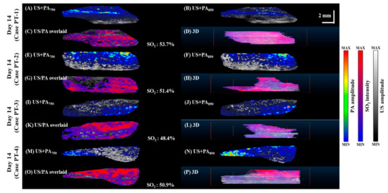 Relative SO2 levels in pancreatic tumor in mice imaged 14 days after the tumor cell injection. (A,E,I,M) PA images acquired at 750 nm overlaid with grayscale US B-mode images. (B,F,J,N) PA images acquired at 850 nm overlaid with grayscale US B-mode images. (C,G,K,O) SO2 was calculated as the percentage of oxygenated hemoglobin relative to total hemoglobin based on dual-wavelength PA imaging at 750 and 850 nm and overlaid with grayscale US B-scan images. (D,H,L,P) C-scan of SO2 dynamics. Rotational 3D images can be seen in Supplementary Materials Video S2.