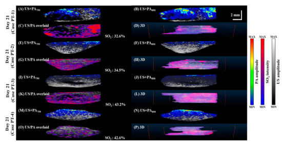 To compare tissue oxygenation in normal vs. tumor-bearing mice, we imaged SO2 levels in the pancreas of normal mice (Figure 5), mice 14 days after tumor implantation (Figure 6), and mice 21 days after tumor implantation (Figure 7). PA B-scan images acquired at 750 nm (Figure 5A,E,I, Figure 6A,E,I,M and Figure 7A,E,I,M) and 850 nm (Figure 5B,F,J, Figure 6B,F,J,N and Figure 7B,F,J,N) were used to calculate SO2 (Figure 5C,G,K, Figure 6C,G,K,O and Figure 7C,G,K,O). The 3D C-scan images (Figure 5D,H,L, Figure 6D,H,L,P and Figure 7D,H,L,P) were generated by combining B-scan images. The corresponding rotational 3D images can be seen in Supplementary Materials Videos S1–S3.