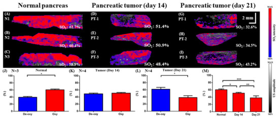 Comparison of the relative SO2 levels in the pancreas of normal and tumor-bearing mice on day 14 and day 21. (A–C) Representative images of SO2 levels in normal mice. (D–F) Representative images of SO2 levels in tumor-bearing mice on day 14 after the tumor cell injection and on day 21 (G–I). (J) Quantification of the levels of deoxy vs. oxyhemoglobin in normal and tumor-bearing mice on day 14 (K) and day 21 (L). (M) Comparison of tissue SO2 in normal, day 14, and day 21 tumors (* p < 0.05, ** p < 0.01, *** p < 0.001).