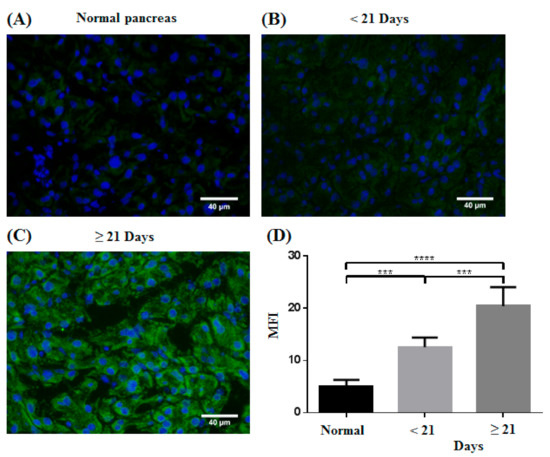 (A–C) Representative images of IHC staining for hypoxia using pimonidazole in the samples of normal pancreas and pancreatic tumors on various days after the tumor cell injection. The nucleus is presented in blue, and areas that stained positive for pimonidazole are shown in green. (D) Quantification of the MFI of pimonidazole staining. (n = 6 for normal pancreas, n = 5 for < 21 days, n = 4 for ≥ 21 days; *** p ≤ 0.001, **** p ≤ 0.0001).