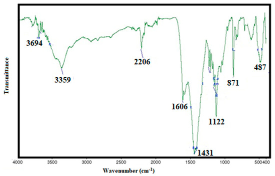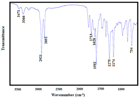 A series of 2-amino, 3-cyanopyridine polymers were synthesized in the presence of benzene by a one-pot synthesis via the Hantzsch reaction [21]. Copolymerization of MMA (maleamide-maleanilic acids) and ST (styrene) was carried out using ABIN as a catalyst. The PSA with molecular weights of 40,000 and 46,341 were for the polymer-grafting process. The composition of the grafted copolymers was analyzed using FT-IR/NMR spectroscopy and GPC analysis. FT-IR spectral results were used to detect the copolymerization of styrene-aryl amide. By comparing the FTIR spectra of copolymer [23] and PSA-(MA-g-ST-grafted polymer) PSMP (cf. Figure 1 and Figure 2), the shift of the IR band at 3344.6 cm−1 was due to the OH stretching vibration of the copolymer. The shift to 3338.8 cm−1 for MA-g-ST with lowering of the intensity is shown, which indicates the participation of hydroxyl groups during the chemical reaction. The FT-IR analysis, shown in Figure 2, further confirmed the grafting of pyridine on styrene-maleic acid (PSMP) with characteristic absorption bands of a strong band at 1666 cm−1 for CO (amide-I) and 1610 cm−1 for stretching of the NH2 group (amide- II). The band at 2208 cm−1was attributed to CN bond stretching and a broad and medium intensity peak at 734–640 cm−1 related to out-of-plane NH wagging vibrations (Figure 2).