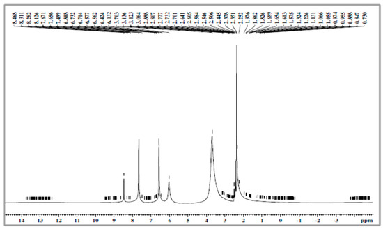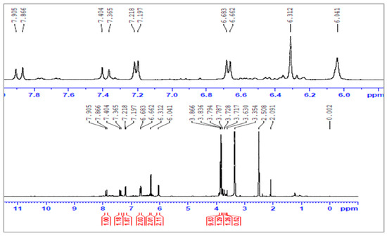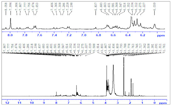 The aromatic protons from grafted-PMAP and -PSMP fluorescent polymer compounds were identified by 1H-NMR spectra, as shown in Figure 3, Figure 4, Figure 5 and Figure 6. Figure 3 and Figure 4 show the 1H-NMR spectra of PMA and PSA, where both polymers had similar structural units and the hydrogen in each structural unit had comparable relaxation times. The 1H-NMR spectra of grafted-polymer PSMP (δ in ppm from in DMSO-d6) with the amide (NH) protons from PSMP showed a broad signature at 8.0 ppm. The peaks appeared at 7.76–7.75, 7.67–7.65 to 6.8–6.3 (doublets, aromatic protons) for the spectra of PSMP (Figure 5). The characteristic peaks of the 3-methoxyl group (3.9 ppm) are shown in Figure 5. The grafted polymers were assigned to the absorption of the -CH-CH- group within the styrene-maleic acid ring and the signatures at 3.8–2.0 ppm related to the maleic acid groups of styrene. As depicted in Figure 5 and Figure 6, the 1H group was identified as an NH attached to the phenyl ring that appeared as a singlet at 8.0 ppm and the (Ar-H) aromatic proton in the range of 6.5–6.3 with (Ar-Cl) aromatic protons appeared as doublets at 7.76–7.67 ppm and 7.68–7.66 ppm.