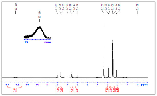 Yield: 3.4 g (86%); 1H-NMR (400 MHz, DMSO-d6): 12.5 (s, 1H, COOH), 9.0 (s, H, NH), 7.67 (dd, J = 6.8 Hz, ArH), 6.56 (dd, 2H, J = 10 Hz, ArH), 3.7 (m, 2H, -CH-CH), and 2.6 (s, 3H, -COCH3-); FTIR (KBr, cm−1): 3395, 3222, 2821, 2354, 1643, 1591, 1396, and 1278.