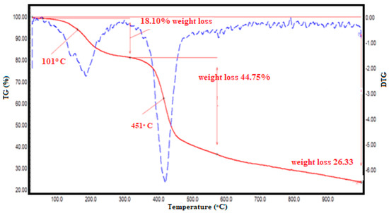 Thermal stability of synthesized polymer samples was characterized by using thermogravimetric analysis (TGA). Dehydration, decarboxylation, and depolymerization are the three stages of degradation that occur on grafted-copolymer pyridine derivatives (PSA). Figure 7 shows the TGA and DTG (derivative thermogram) of grafted polymers with two definite zones of weight loss. The weight loss relates to the liberation of water in the temperature range of 113–200 °C. The respective mass change was obtained around 18.1%. In the next stage, the weight loss in the temperature range of 311–575 °C was observed around 44.8%, due to further liberation of CO2 and other carbon derivatives of the framework [26,27]. On further heating, the complete decomposition of polymer occurred at 954 °C at the third stage, with a final weight change of 26.3%. The presence of appreciable events near 161 °C, 451 °C, and 954 °C in the DTA profile clearly showed the thermal stability pattern for synthesized poly (styrene-maleic acid-g-maleamide) PSA polymer (cf. Figure 7).