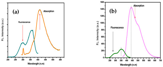 Zhao and his co-workers reported the preparation of an emissive polymer from a non-fluorescent monomer [22]. In their study, polymers such as styrene and vinyl amide were utilized as monomers for the interaction between the carbonyl group and the phenyl ring in the polymer, which are the key ingredients for the observed light emission with a maximum intensity at 330 nm in DMF solution. The absorption spectra of the maleimide-styrene copolymer were checked in various solvents, where they were freely soluble in DMF and DMSO at a polymer concentration of 10–6 M. In Figure 10a,b, it is clear that the small shoulder for the absorbance band obtained for PSMP1 near 550 nm compared to PMAP and PMAP1, where additional absorption occurred due to the functional group present in the PSMP1. In the case of the fluorescence spectra of PSMP and PSMP1, the grafted PSMP1 showed the reduced peak intensity, with emission peaks at 300 nm and 365 nm, compared to PSMP (cf. Figure 10a). Hence, it was confirmed from the fluorescence results that the excitation and emission spectra of the PSMP and PSMP1 polymer indicated a blue emission band [23].