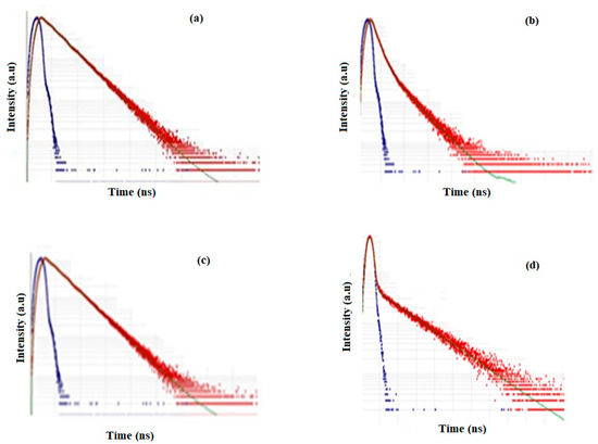 The grafted copolymer had a structure similar to PSA, as per the photoluminescence studies of the two polymers (λmax 330–316 nm for PSMP1, and PMAP1). The PSMP1-grafted polymer displayed a broad emission band at 400–500 nm (maximum wavelength 460 nm) [24,25,26,27,28]. The highest emission intensity was observed for PSMP and PSMP1 upon excitation by irradiation of the blue region. Figure 11 shows the absorption and fluorescence spectra of the homopolymers (PMAP, PMAP1) that showed similar absorption maxima (λmax = 450 nm). There were no other shoulder bands observed from PMAP and PMAP1, as compared to the PSMP1-grafted polymer. The fluorescence emission peak for both PMAP and PMAP1 revealed that the λem values were 360 nm and 335 nm, respectively. The additional functional groups in PMAP caused a reduction in the fluorescence peak intensity. The role of the solvent played an important role in color formation of the polymer and the grafted forms. According to the results summarized in Figure 9, Figure 10 and Figure 11, similar solvent effects on the emission spectra of PMAP and PMPA1 were observed. Compared with PSA, the solutions of PSMP and PSMP1 were more intensely colored in the same solvent. The smaller number of pyridine groups in PSMP and large steric hindrance imposed by the methoxy group in PSMP may have affected the extent of their interaction with the solvent, thus enhancing the changes in absorption and emission. The fluorescence lifetime spectra of all synthesized polymers are shown in Figure 12. The fluorescence lifetimes (2.57–6.5 ns) indicated that the grafted polymer had excitation of a proton to a higher energy state that was favored by the presence of the rigid molecular structure in the prepared polymers [29,30,31,32]. Figure 12a,b shows differences in the lifetime of emission and excitation of PSA and PSMP. The other prepared polymers, PSMP1 and PMAP (cf. Figure 12c,d), also showed a higher lifetime for excitation of protons to higher energy compared to PSA and PSMP [28].