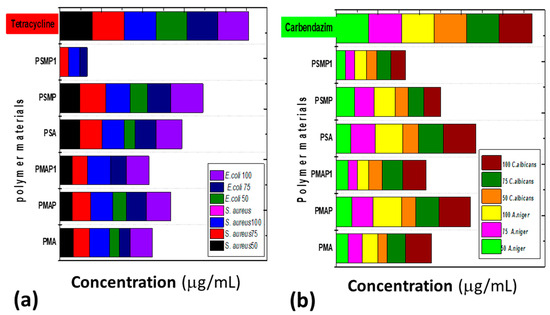 Herein, the prepared fluorescent polymers were subjected to antimicrobial activity against S. aureus MTCC 25923 and E. coli MTCC 25922 pathogens, where tetracycline was used as a positive control. PSMP was effective in controlling both the pathogens with a high zone of inhibition at a concentration of 50, 75, and 100 μg/mL. However, it is interesting to note, at higher concentrations (100 μg/mL), the zone of inhibition was similar to the positive control. PSA (11–21 mm), PSMP1 (7–9 mm), and PMAP (10–26 mm) showed affected zones of inhibition for both bacterial strains (cf. Table 2). The antifungal activities of the as-prepared pyridine polymers were evaluated using C. albicans and A. niger fungal pathogens. The prepared PSA, PMAP, and PSMP showed the effective zone of inhibition for C. albican pathogens at higher and lower concentrations. In the case of fungal pathogen A. niger, the pyridine-based polymers (except PSMP and PSMP1) showed an effective zone of inhibition related to control of Carbendazim. The higher anti-fungal activities observed for PSA, PSMP, and PMAP pyridine polymers for pre- and post-grafted bulky polymer structures hindered the active sites present in the pyridine derivative, which may account for the lowered activity of grafted polymers such as PSMP1 and PMAP-1. Figure 13 and Figure 14 show an illustrative bar graph of the activity ratio for as-prepared pyridine polymers for antibacterial and anti-fungal activities [26,32,33]. The schematic expression of E. coli bacteria in the presence of the control (tetracycline) and the activity of cell expression of the synthesized pyridine polymers for bacterial activity is shown in Figure 14.