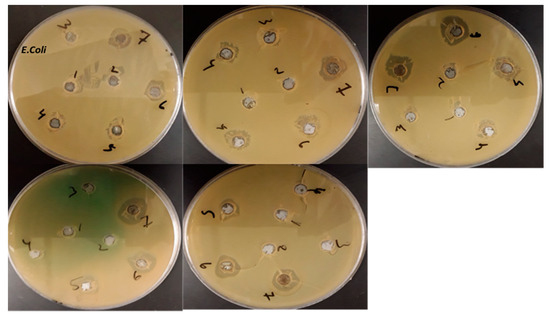 Photographic images of the anti-bacterial expression of E. coli bacterial strain at different concentration (10–100 µg) values for pyridine-based, synthesized polymers.