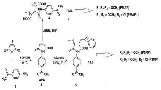 Synthesis of PSA was preceded by the reaction of APA (2.33 g), styrene (1.04 g), and AIBN (0.25 mg). In a 100-mL, two-necked, round-bottom flask equipped with a condenser and a magnetic stirrer, which was maintained in a dry nitrogen atmosphere throughout the reaction, at room temperature, AIBN (0.25 mg) was dissolved in THF (10 mL), transferred to the flask containing APA (2.33 g), and degassed with dry nitrogen for 30 min. Then, styrene (1.04 g) in 10 mL of THF was injected into the reaction mixture with constant stirring. The reaction temperature was increased to 50 °C and stirred constantly. After 3 h, the reaction mixture with the crude PSA started to precipitate, where 50 mL of ethanol was added and allowed to reach room temperature. The crude product was filtered, washed with ethanol (20 mL × 3), and dried overnight in a vacuum oven. The molecular weight of the copolymer was determined by gel permeation chromatography (GPC) using THF. The synthesized PSA was characterized by spectral analysis (IR, 1HNMR, GPS, and UV-Vis). Yield: 3.75 g; 1H-NMR (400 MHz, DMSO-d6): 12.2 (s, 1H, COOH), 8.0 (s, 1H, NH), 7.67 (dd, 2H, J = 8.8 Hz), 6.0 (m, 5H, ArH), 6.57 (dd, 2H, J = 8.8 Hz), 3.5 (m, 2H, -CH-CH), and 2.7 (s, 3H, -COCH3-); FTIR (KBr, cm−1): 3182, 2353, 1652, 1593, 1526, 1401, 1273, 1668, and 920.