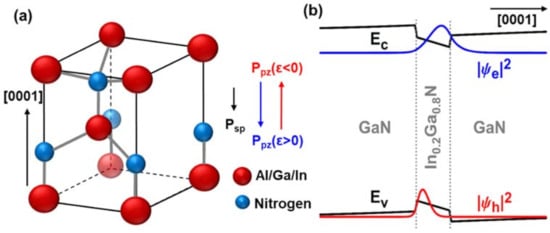 (a) Schematic Wurtzite nitride structure and the direction of spontaneous polarization (Psp) and piezoelectric polarization (Ppz). (b) Band diagram of undoped 3 nm GaN/In0.2Ga0.8N/GaN quantum-well grown along c-axis with wavefunctions in a ground state.