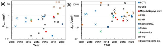 Benchmarks of (a) maximum output power (Pmax) and (b) threshold current density (Jth) of electrically pumped nitride blue VCSELs in chronological order of publication. Device parameters were extracted from references [11,12,21,22,23,24,25,26,27,28,29,30,31,32,33,34,35,36,37,38,39,40,41,42,43,44,45,46,47,48,49,50,51,52,53].
