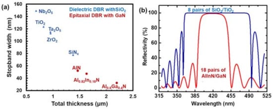 n2 is the high refractive index in the DBR pair, which is usually the index of GaN in epitaxial DBRs; n1 is the low refractive index, which is usually the index of SiO2 in dielectric DBRs, and m is the number of pairs. To achieve R > 99%, the minimum m can be estimated by Equation (3). The corresponding Δλstop, total thickness, and representative reflectivity spectrum are plotted in Figure 3. Apparently, the epitaxial DBR possessed a lower bandwidth and a higher total thickness, which imposes a stringent criterion for strain management (except for the Al0.82In0.12N/GaN DBR, which is the lattice-matched condition). As a result, current nitride VCSELs adopted either one (hybrid-type) or none (dual-dielectric type) epitaxial mirrors as reflectors. Each approach also encountered its own difficulties in the fabrication process.