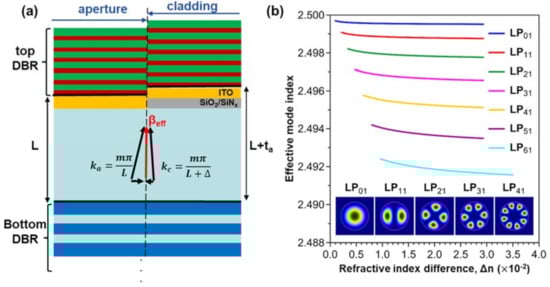 where m is the mode number. Since Δ << L, we can reasonably assume that m is the same integer in both regions and ka > kc. Therefore, while constructing the propagation mode with a common effective mode propagating constant (βeff), the oblique angle of the k-vector in the aperture region will be larger than that in the cladding region. As a result, the optical energy will be constantly leaking out of the cavity in the lateral direction during oscillation, which is also known as the anti-guiding effect. The anti-guiding effect is more significant for high-order linear polarized (LP) modes due to a smaller βeff, as simulated in Figure 4b. The anti-guiding effect causes a prevailing fundamental mode (LP01) from other high-order modes, which might be desired for some applications, but the device performance such as Jth and Pmax will be limited. According to Hashemi et al.’s analysis, the lateral anti-guiding effect contributes ~50% of total modal loss for fundamental LP01 mode and ~70% of total modal loss for LP11 mode [63]. In other words, the threshold modal gain is increased at least two-fold due to the dielectric aperture.